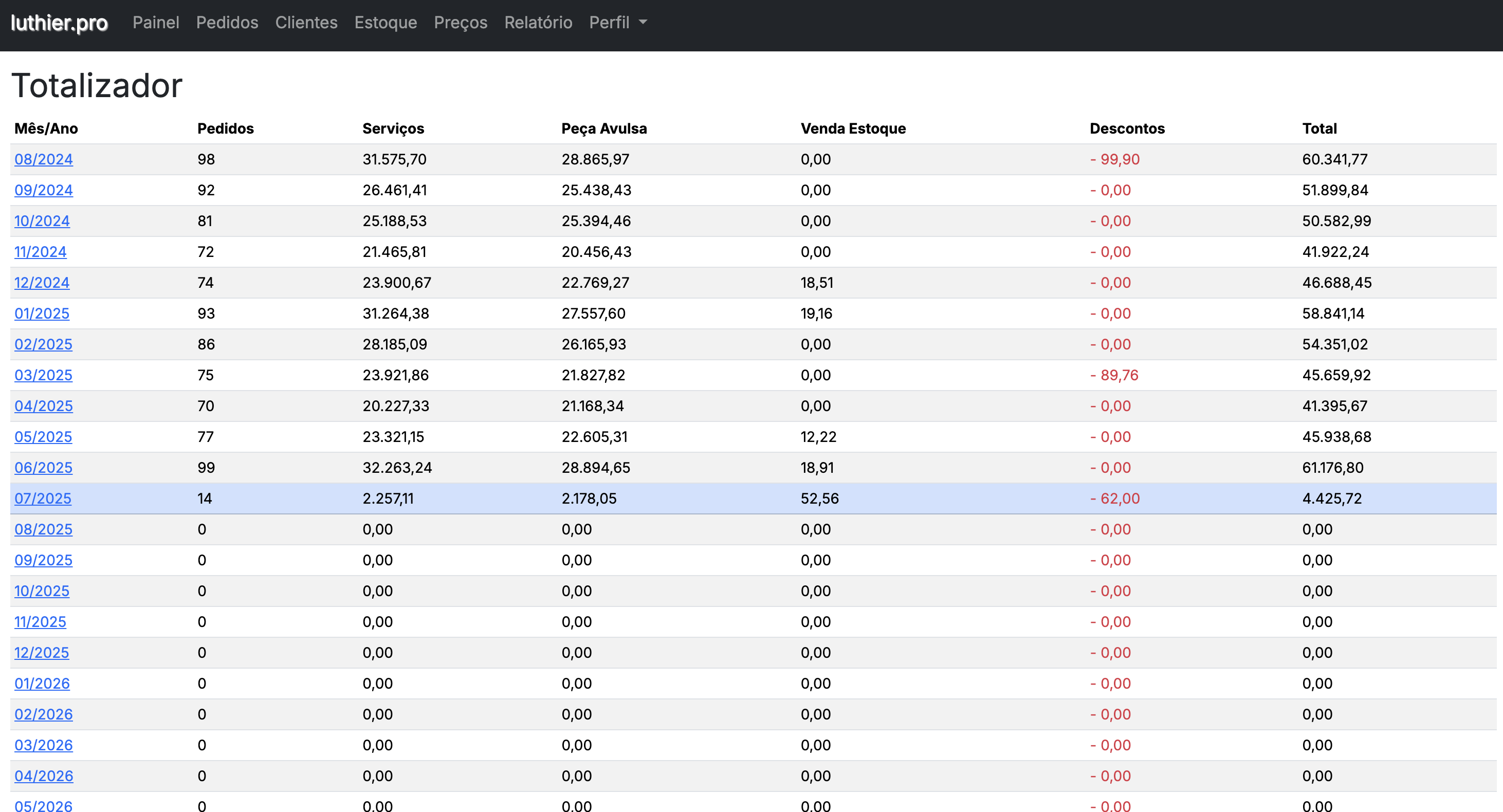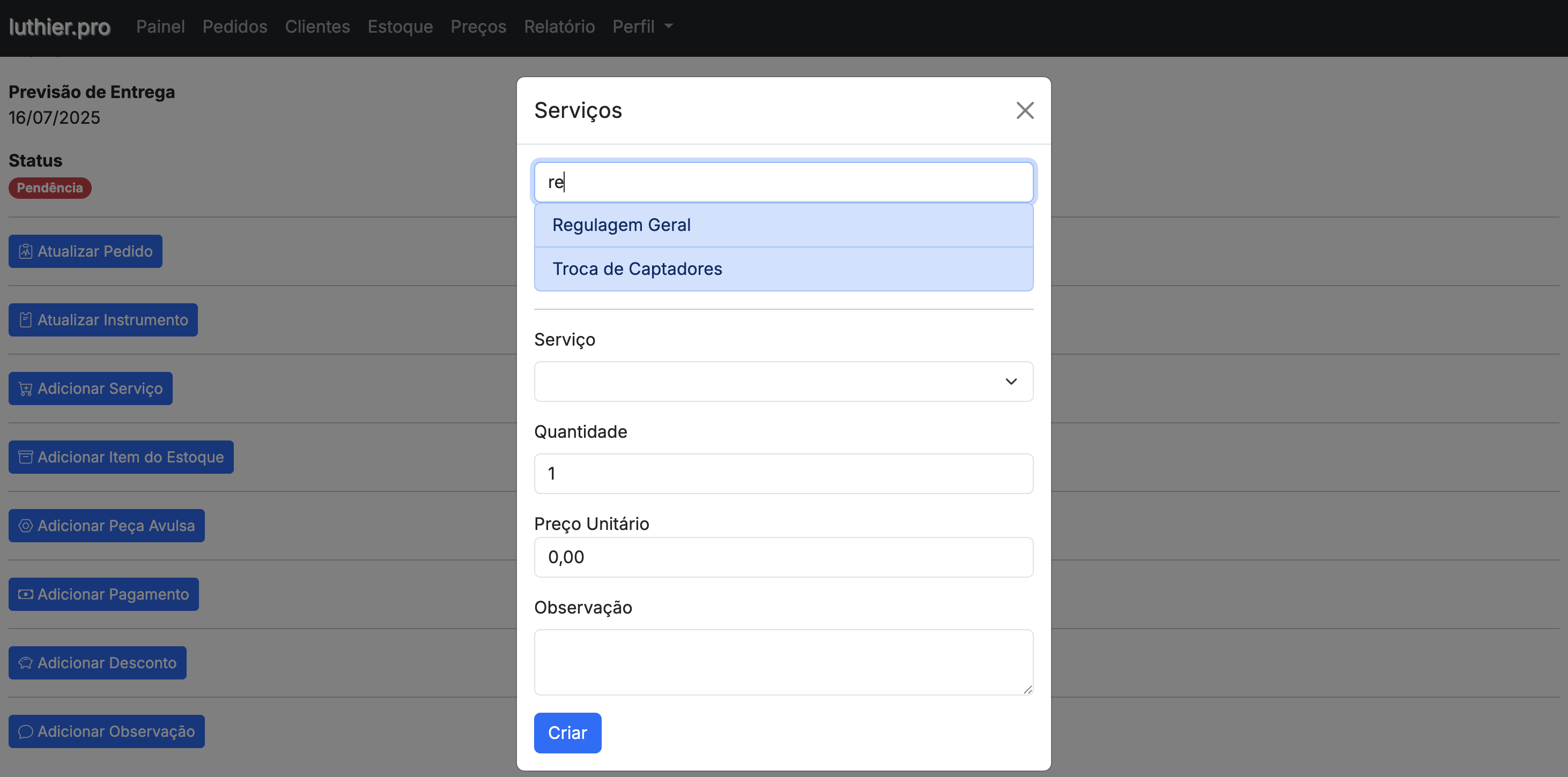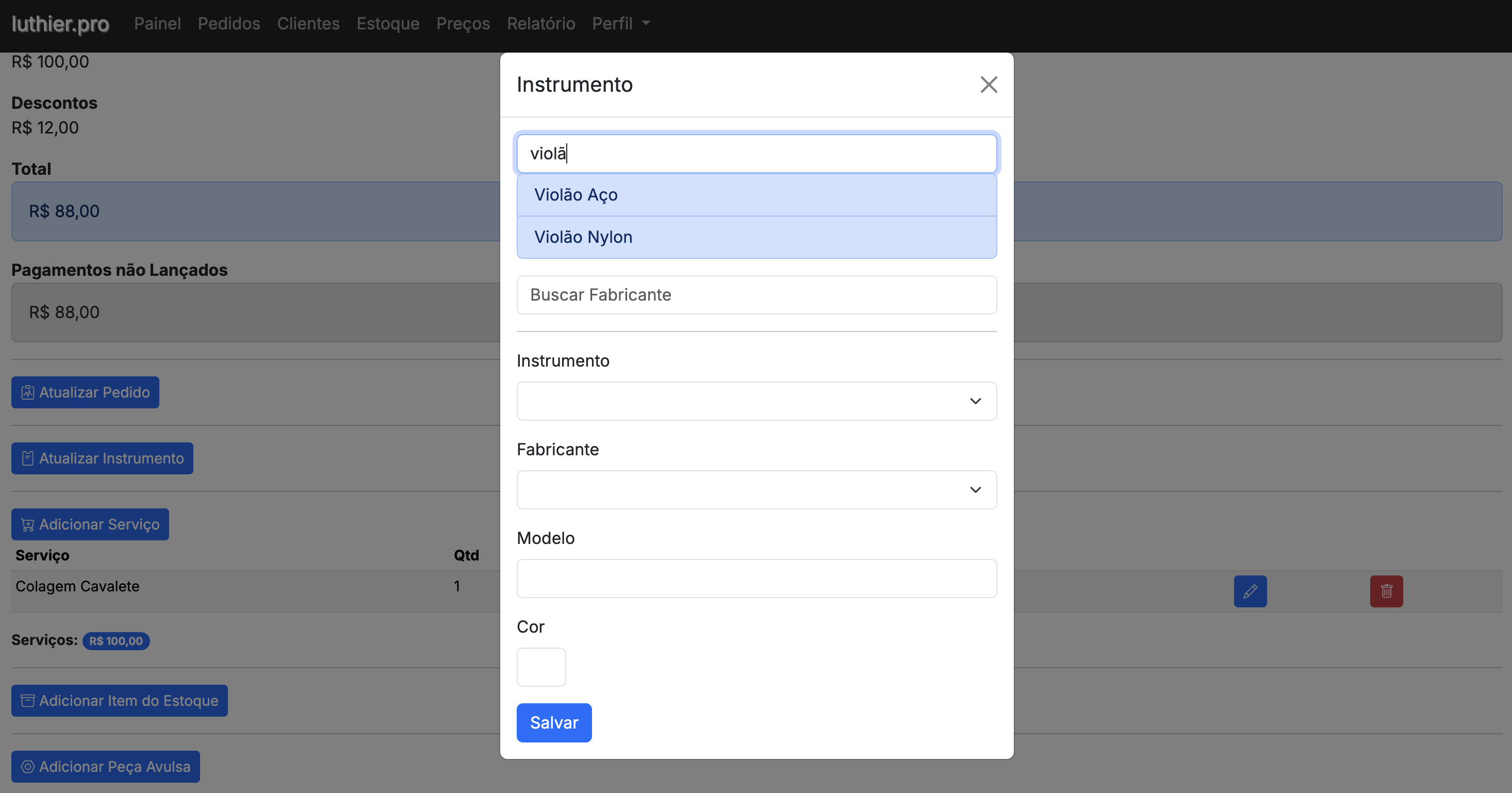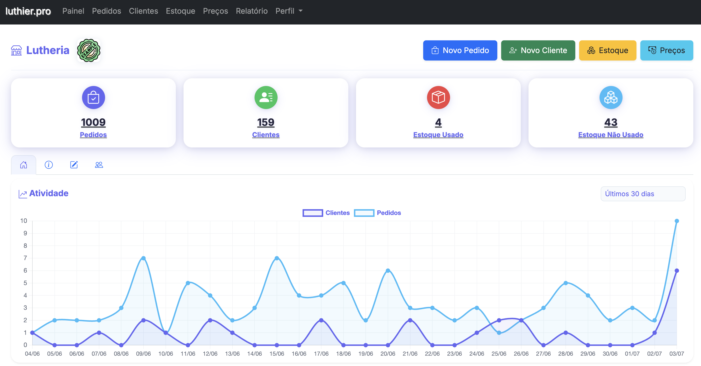 Pensado 100% para luthiers: já vem com fabricantes de instrumentos e serviços de lutheria pré-cadastrados, economizando tempo e facilitando sua rotina desde o primeiro acesso.