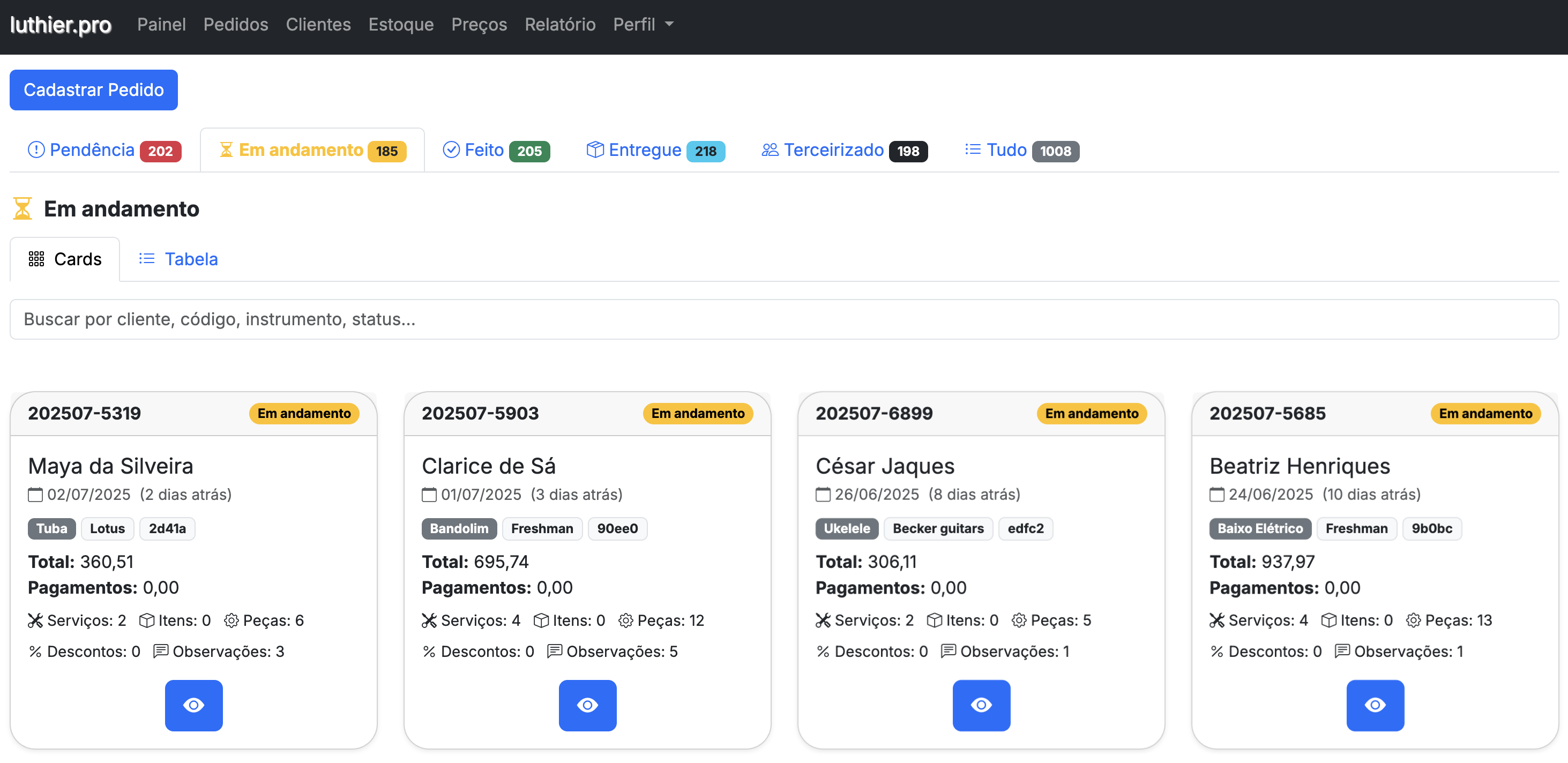 “O Luthier Pro transformou a rotina do meu ateliê. Hoje tenho controle total dos pedidos e consigo dedicar mais tempo à qualidade dos instrumentos.”