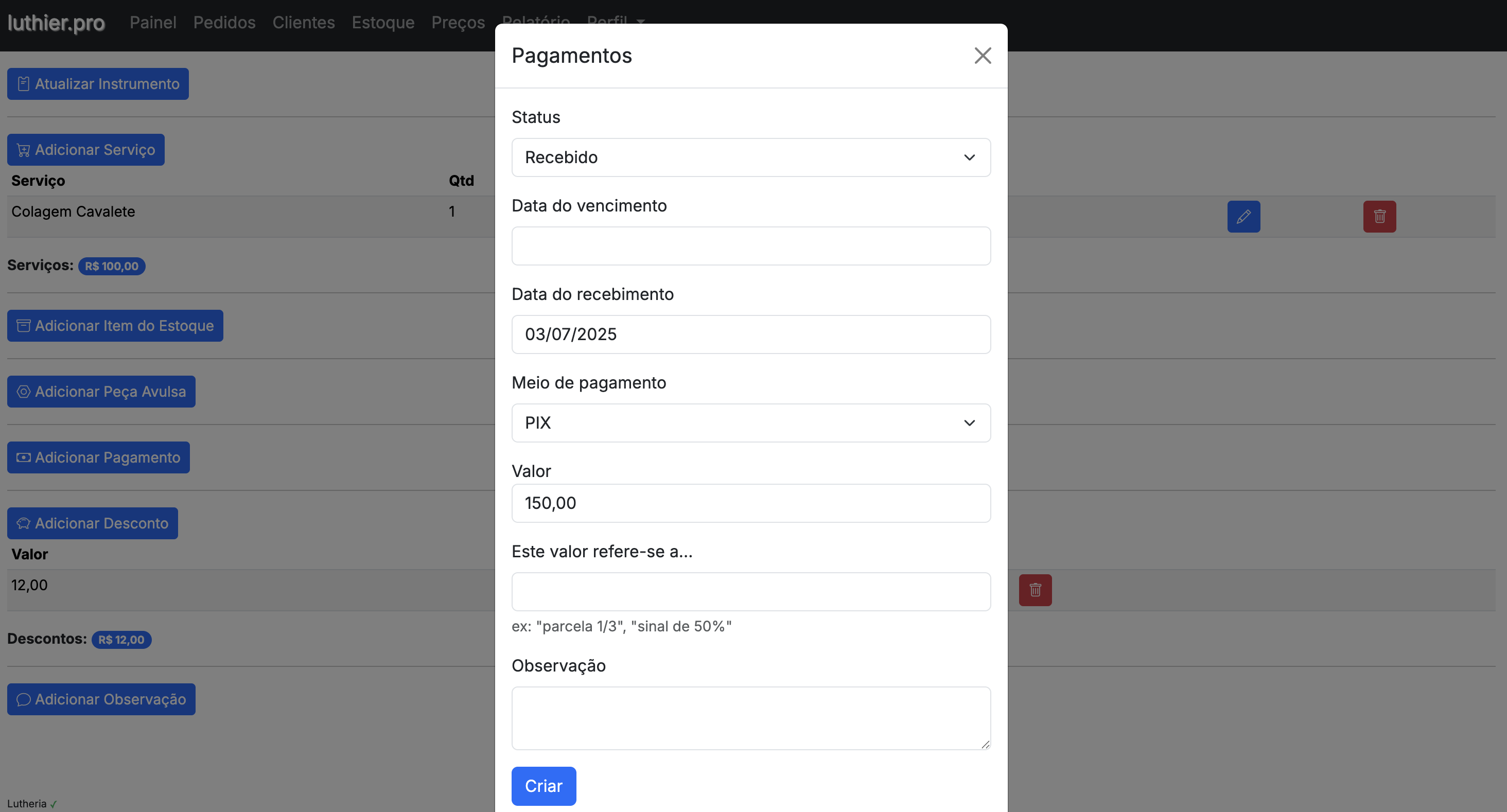 O Luthier Pro oferece uma plataforma completa para gestão de pedidos, clientes, estoque e finanças. Eleve o padrão do seu ateliê com tecnologia, segurança e atendimento diferenciado.